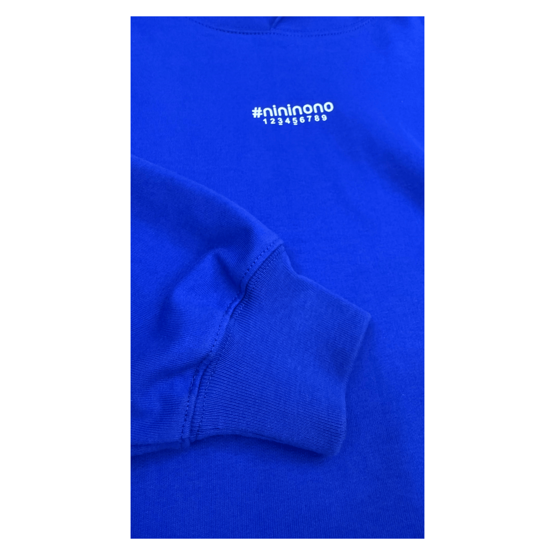 Hooded pullover sweatshirt dress in soft 330g/m² cotton. Bold Klein blue with abstract number print and transparent tape logo effect. Double-layer hood, versatile for layering. Modern essential for kids & teens.